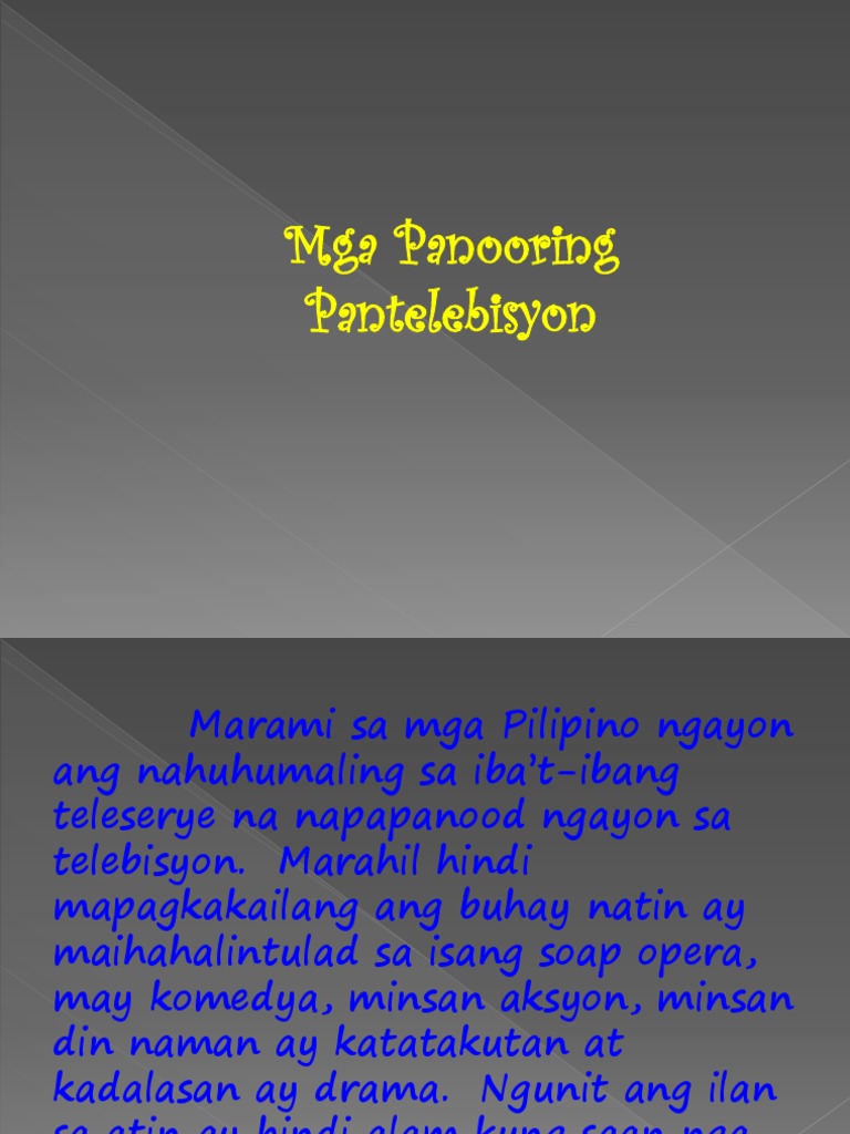 Sintesis Ang telebisyon ay mahalagang parte ng buhay at kultura ng bawat Pilipino. Subalit kahit matagal ang pagsakop nila sa Pilipinas ang kulturang Pilipino ay patuloy pa ring makikita. Mga Pananaliksik sa Wika at Kulturang Pilipino.